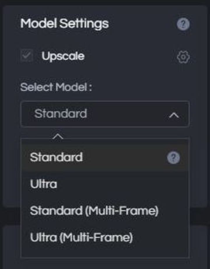 On the Upscale option, you can select the model as Standard, Ultra, Standard (Multi-Frame), and Ultra (Multi-Frame).