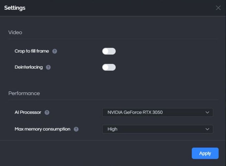 On the Performance Settings, you can choose the "AI Processor" to determine what hardware (GPU or CPU) will be used by the application when processing, and "Max memory consumption" to Lowest, Low, Medium, High, and Highest. "High" is recommended if you close any other programs on your computer.