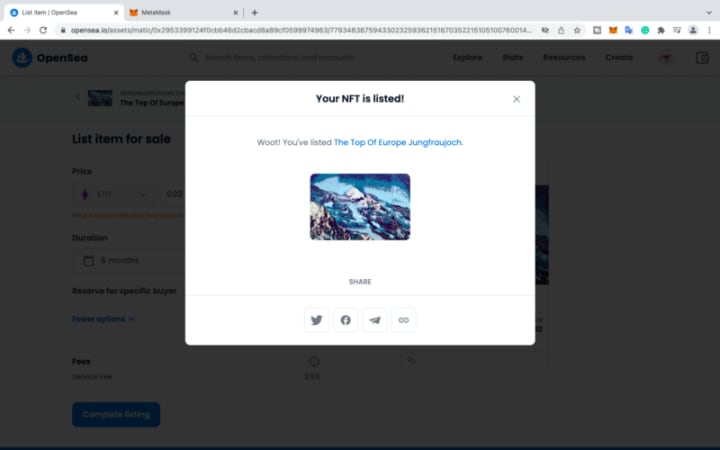 You will see a popup page that your NFT is now listed.