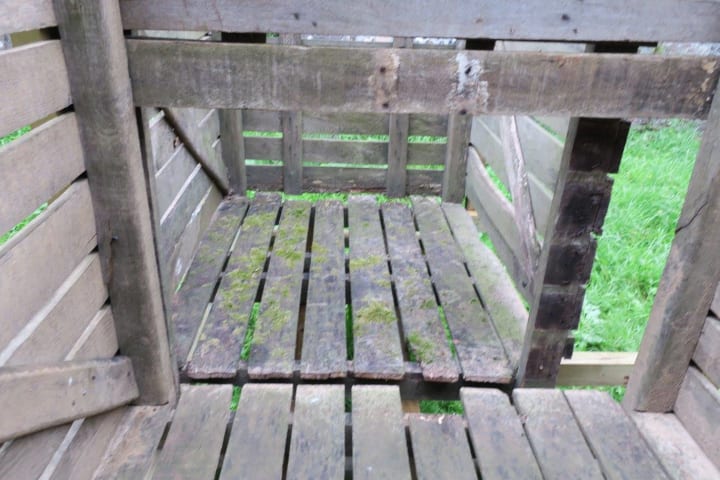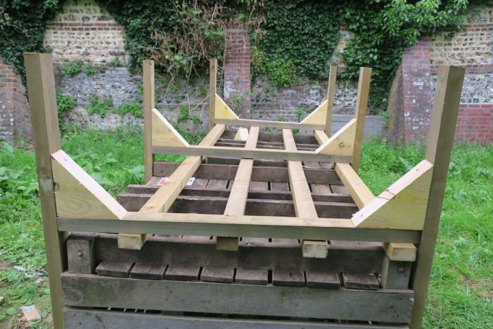 First I wanted some box pallets, quite hard to get hold of, but a local potato farmer gave me these rubbish ones falling apart. They were in his firewood store and he delivered them to me for about £25. I tried to buy 2 new ones off him, he had 300 on site ready for the harvest through the summer, he just looked at me and laughed. So this is what I started with.