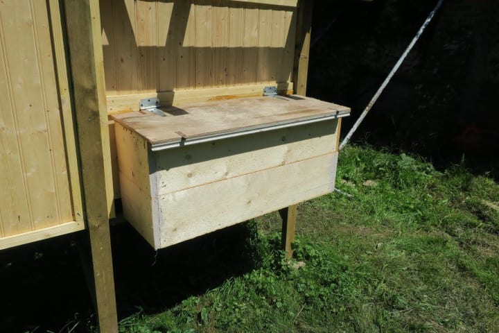 You are going to need an egg box, a place where chickens lay eggs, so make another hole, yes we used a chainsaw again. then strengthened the opening with some wooden off cuts.