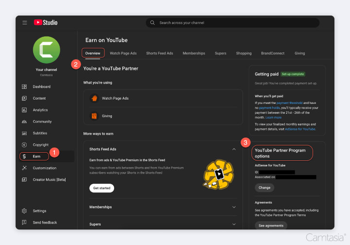 Setting up your AdSense account is super simple. From the YouTube Studio go to the “Earn” tab. From there, you can apply for the YouTube Partner Program. Once your application is approved, you’ll be able to connect to an Adsense account.