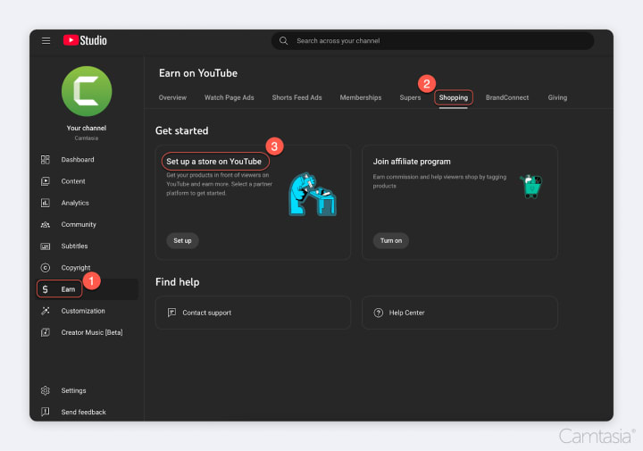First, YouTube requires users to choose an approved merchandise platform. In the YouTube Studio, you can connect a merchandise partner’s store with your YouTube channel under the “Earn” tab.
