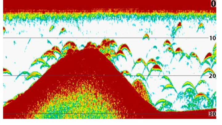 Fish school echo; if you hover the cursor over the displayed echoes, it shows the distance from your ship to the fish school, as well as the target's depth and where it is located in relation to your vessel.