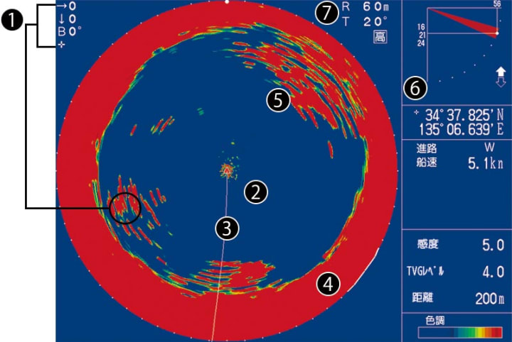 - Sea current echo (Located insided the circle, it generally looks like irregular echoes)