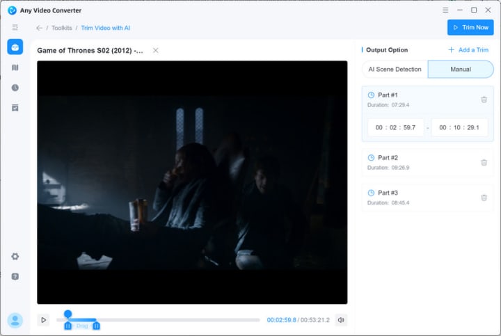 The trim tool of Any Video Converter can not only trim MKV video to delete the unnecessary parts, including trimming MKV into clips by timestamp, but also automatically split MKV video into slices by analyzing the transitions and chapter information.