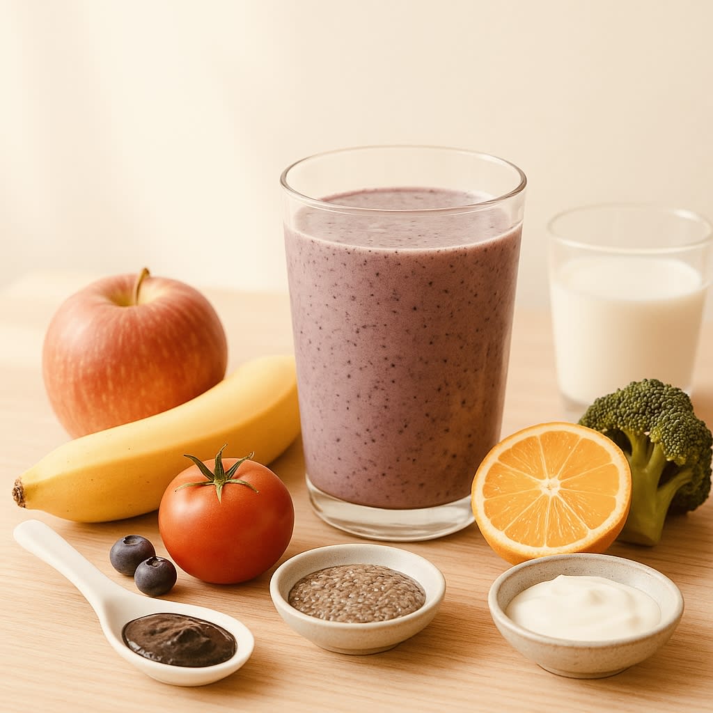I blend together apples, bananas, tomatoes, oranges, blueberries, celery, broccoli—whatever’s in season.