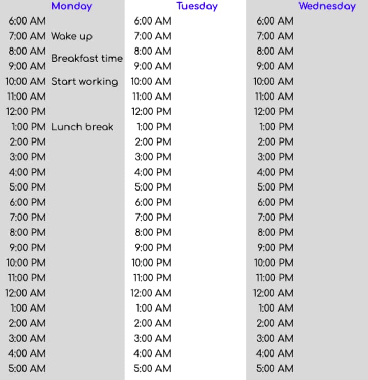 3) Fill out your day with time slots and activities that you usually do at this time.