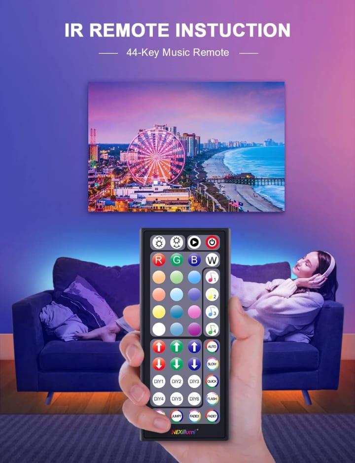 The Nexillumi 100 ft LED Lights are an innovative accessory that adds a pop of color and ambiance to any room. With its long length, these LED lights can be used to decorate walls, ceilings, and even furniture. The LED lights are also equipped with a remote control that allows you to choose from various lighting modes and colors, providing the perfect atmosphere for any occasion.