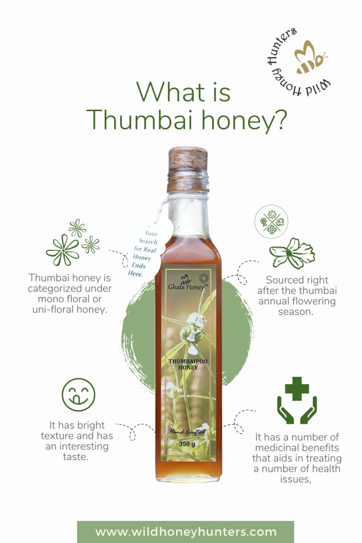 Thumbai honey falls under mono floral or uni-floral honey. Sourced right after the thumbai annual flowering season. It has attractive bright texture and has an a very good taste. It has various medicinal benefits that aids in treating a number of health issues, let us move further.