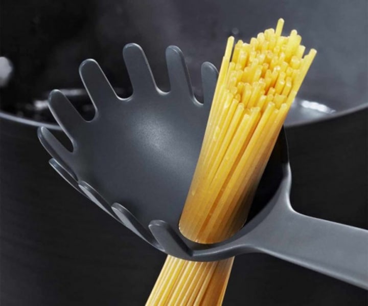 Use the hole in the center of your pasta spoon if you're ever unsure how much pasta to put in for boiling. For comparison, it equals exactly one serving of dried noodles. When it's done, use the spoon to remove the spaghetti as you would usually.