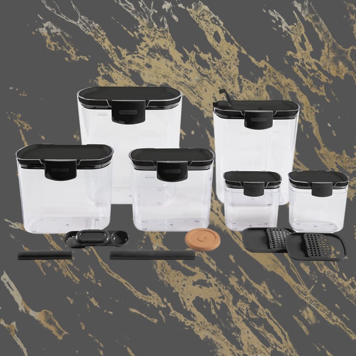 The Easy Storage 6-Piece Set is a convenient solution for neatly storing baking ingredients. With airtight seals and hinged lids, the containers are easy to fill and dispense from. The set includes containers for flour, sugar, brown sugar, powdered sugar, and two mini keepers. Each container has unique features like measurement marks, removable levels, pour spouts, terra cotta disks, dusting spoons, and dusting screens. The set is dishwasher-safe and made of plastic, silicone, and stainless steel. It comes in a stylish white and clear color combination. Overall, it offers a practical and efficient way to store and use baking ingredients.