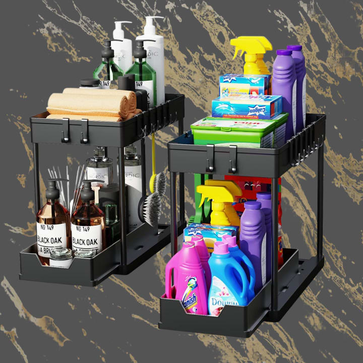 The artzon Under Sink Organizer is a versatile storage solution with a 2-tier design and slide-out basket for easy access. Made from high-quality ABS plastic and sturdy wrought iron, it provides durable and stable storage. With dimensions of W8.5'' x D15.5'' x H15.35'', it can hold various items and has 16 hooks for hanging small items. Installation is quick and tool-free, making it suitable for bathrooms, kitchens, living rooms, and more.