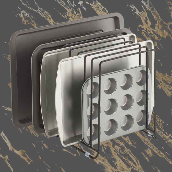 The cookware organizer rack is a versatile and efficient solution for organizing your kitchen. With 8 compartments, it securely holds and separates pots, pans, lids, and more. It can be used vertically or horizontally to maximize your kitchen space, whether on countertops, in cabinets, or under the sink. Made of sturdy steel wire with a durable finish, it ensures long-lasting use. The rack is also suitable for organizing items in offices or craft rooms. With dimensions of 11.5" x 9.5" x 11" high, it offers a compact and functional storage solution for your cookware.