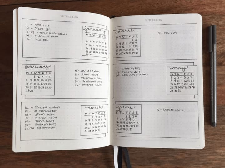 • Future log: is where you write out the months and leave some blank space for each one, where you will later add events such as appointments, birthdays, and so on. Here you write anything that falls out of the current month.