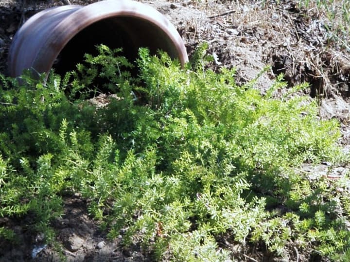 Any broken terracotta pots are laid on their sides, planted with ivy or a fern randomly growing out, making it into a ‘spill pot’. They fit in well and look very effective, a hint to the abandoned faded glory of times long past.