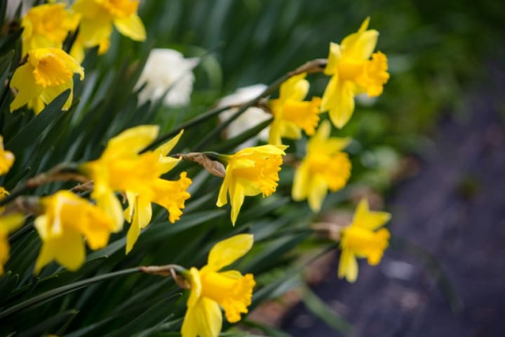 When the snowdrops stop flowering, daffodils push through the soil, their leaves covering the fading snowdrop flowers and foliage. Daffodils are such a wonderful uplifting sight in early spring.