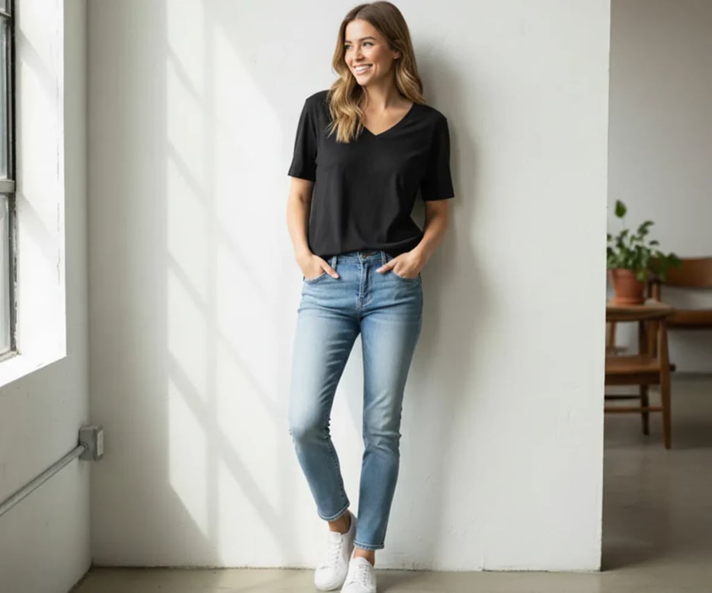 A v-neck tee can elongate the neck and add a touch of elegance. It’s a feminine alternative to crew necks, especially when you want something a little more flattering or wanting to show a pendant necklace. I love wearing it on days I want comfort and a little class.