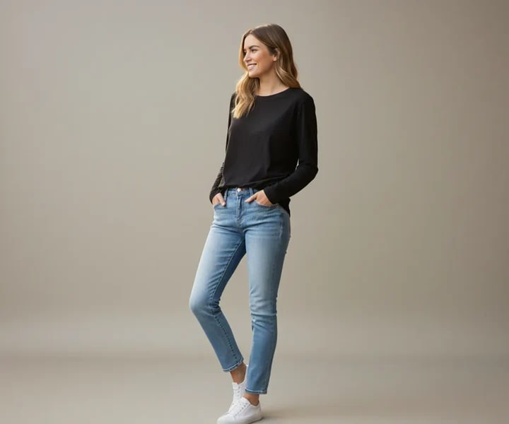 Tip: Choose a long-sleeve tee with cuffed or finished hems, and length that hits your hip or slightly lower (so you can half-tuck if needed).