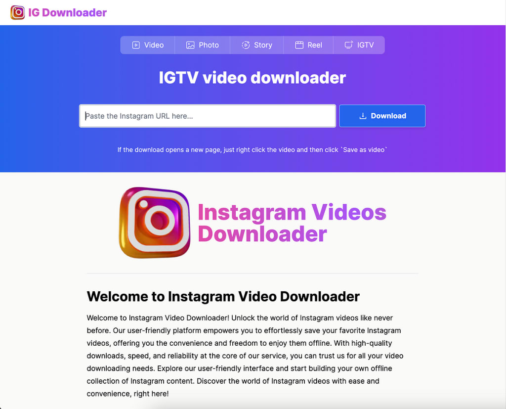 IGTV Downloader is a versatile tool designed to empower users with seamless access to their favorite IGTV videos. By allowing users to download these videos directly to their devices, it ensures that they can preserve and enjoy their favorite moments at their convenience. Whether it's a captivating travel vlog, an inspiring tutorial, or a heartfelt message from a favourite creator, it offers users a simple and efficient way to curate their own personal library of cherished content.