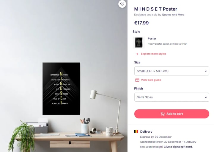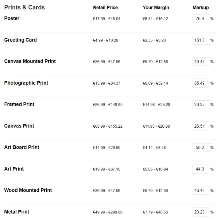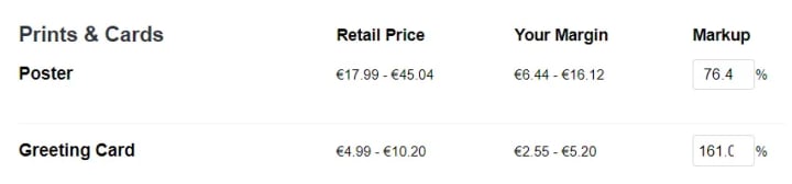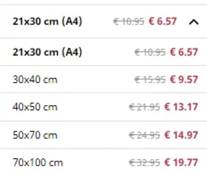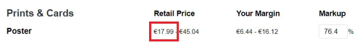 In comparison, the SMALL sized posters from Redbubble are 41.8 x 58.5 in dimensions. The original price of the screenshot above is around 22 euros (without the discount) — so my Redbubble price should be around 20 euros as well. I priced my posters at €17.99 — a markup of 76.4%.