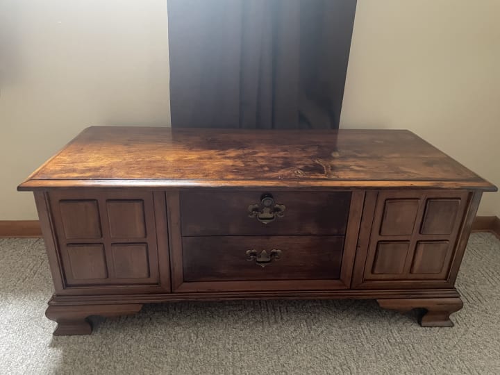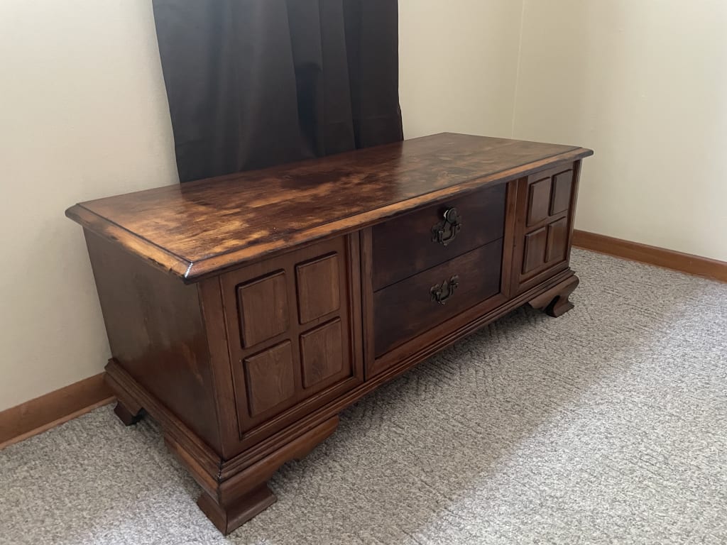 About a month ago, I spotted a pretty beat-up but still beautiful cedar chest at our local Good Shepard store. Made by Lane Co. of Altavista, Va. probably about a hundred years ago, it has the Aroma-Tite seal that doesn’t betray expectations: The chest still smells like cedar.