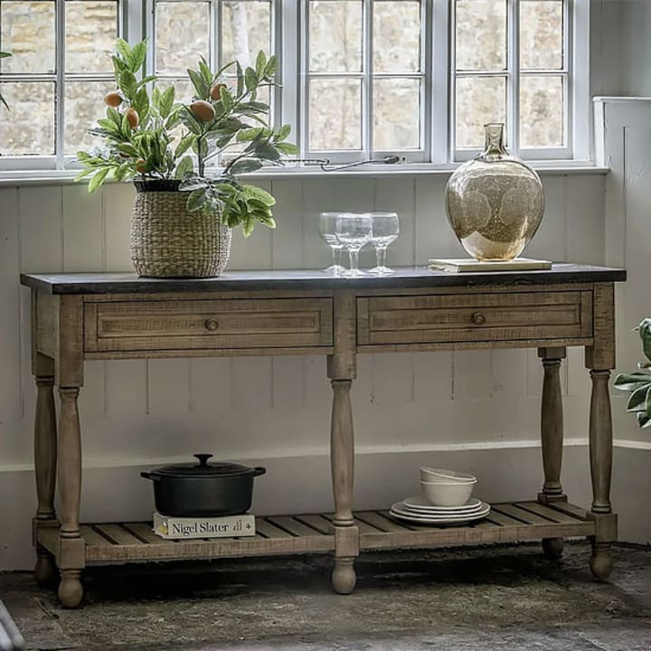 If you are looking to elevate a blank wall space and add sophistication to your interior, then Rustic Country Farmhouse Cottage Console Tables offer an easy way to achieve this and so much more. They are elegant wooden structures that are uniquely formed to create a graceful and striking platform. The solid wood structure offers a strong and rugged frame that can be finished in a multitude of tones. There are warm orange wood colours, grey textured finishes and even a combination of paint and natural wood, as each design creates a different look and feel. There are a few key design features that resonate with country and rustic furniture pieces. You may find on some pieces like turned legs, moulded tops and cross brace frames, all adding interest and detail to this favourable decor trend. You may also find the introduction of metal on some rustic-designed console tables, as this is a popular choice to create a sleek and simple frame to complement the natural wood console top.