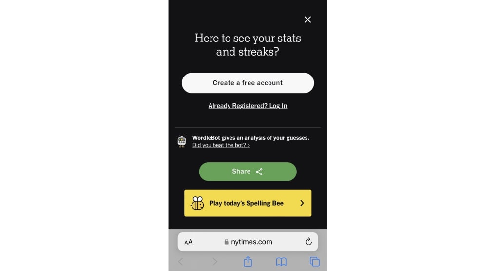 I never thought much about registering. I did it even without thinking hahaha. Mike and I always share our results with each other. Apart from Wordle, I play many other once a day games as well