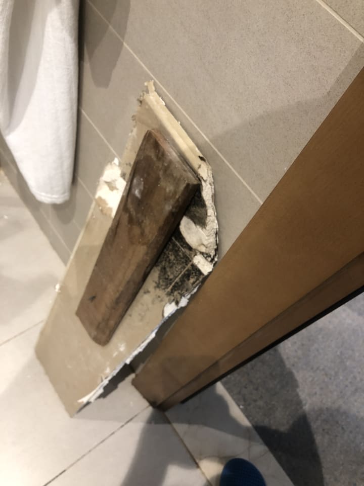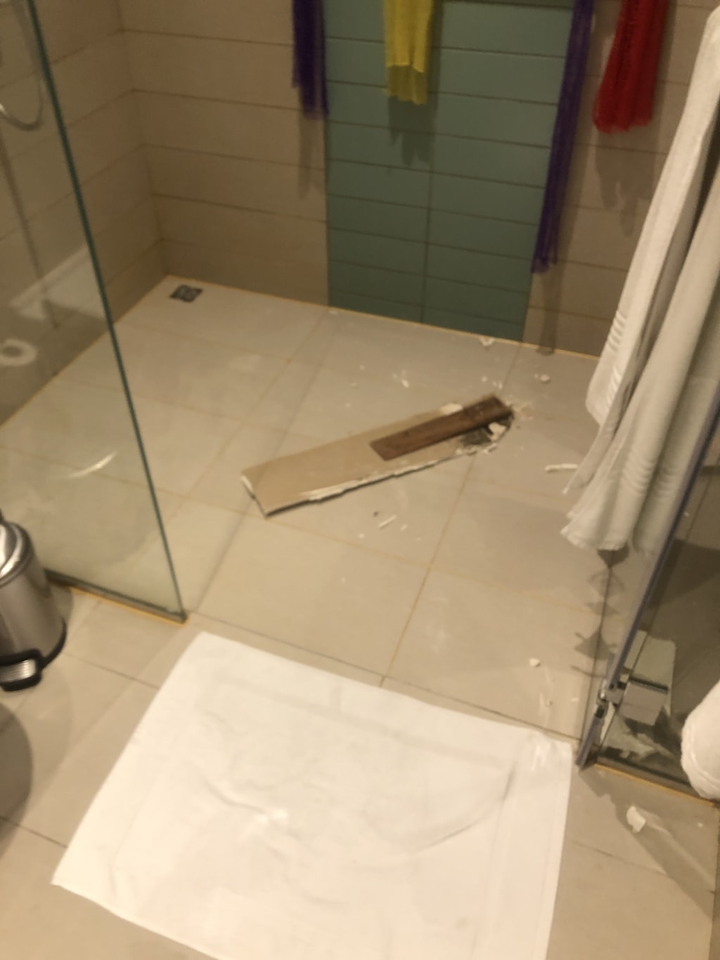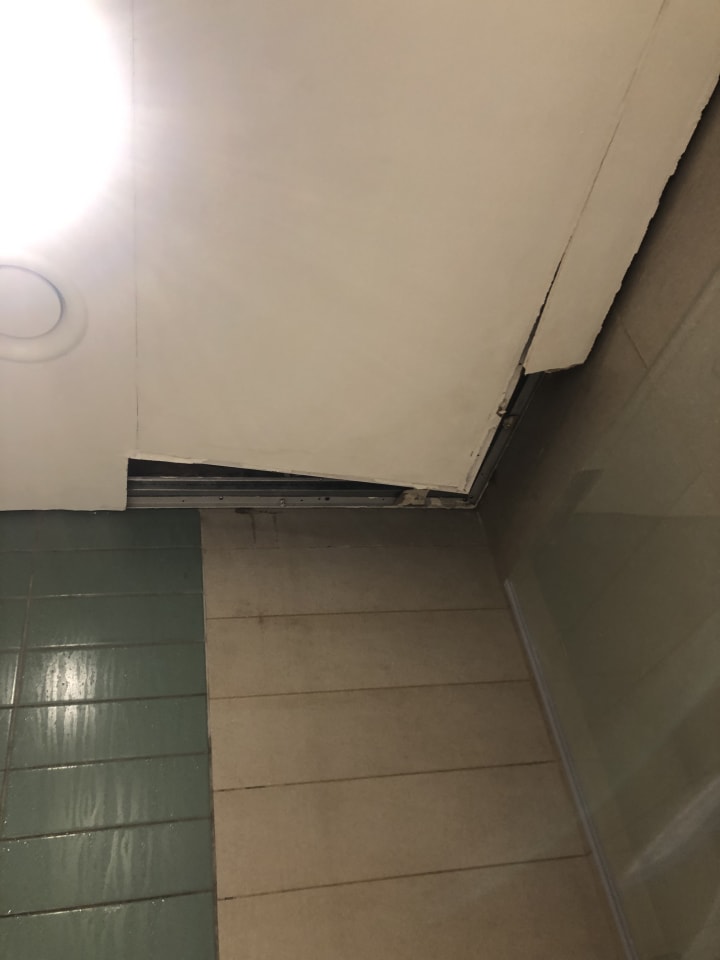 My son was taking a shower and a significant part of the ceiling fell on him as he was taking a shower. I ran into the bathroom to find him in tears clutching his head.