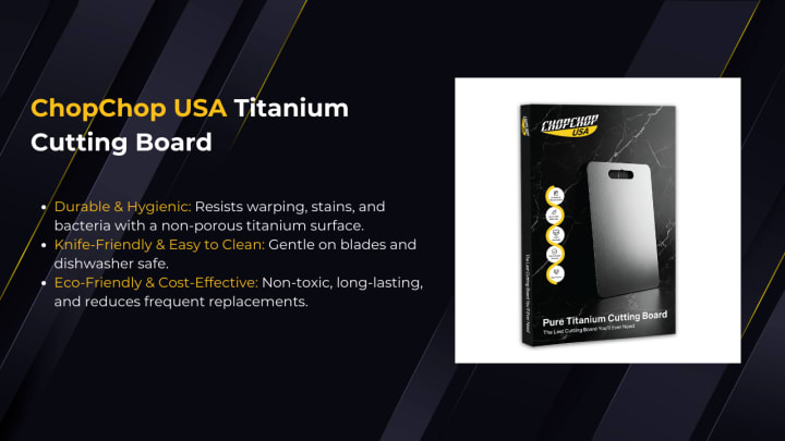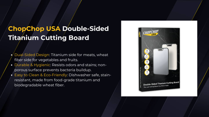 One standout pick is the Chop Chop USA Double-Sided Titanium Cutting Board — combining a titanium side for meats and a biodegradable wheat fiber side for produce. As one of the safest cutting boards, it’s ideal for health-conscious cooks who value hygiene and versatility.