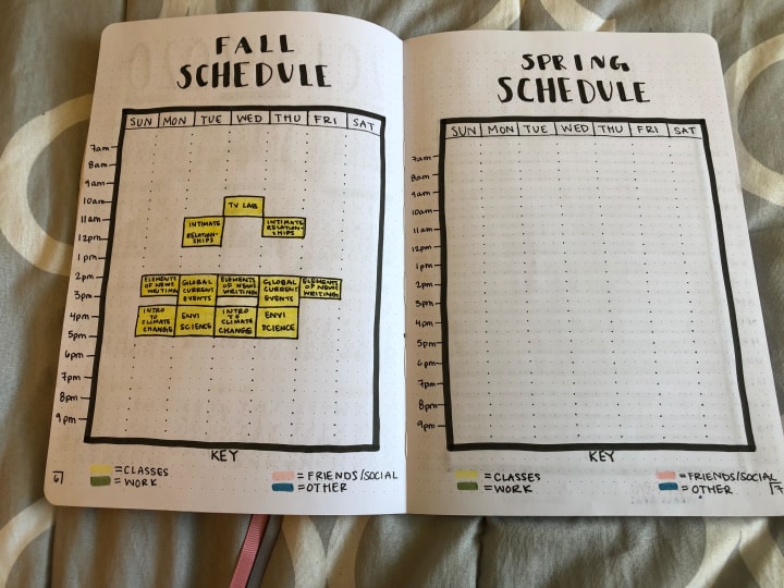 I suggest having your schedule for the semester (if you're a student, if not maybe have one page for your work schedule and one page for your social schedule!). I found this to be really helpful since I have both my school and social calendar on my phone; this spread helped me to see a cleaner version of my academic commitments.