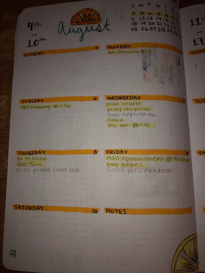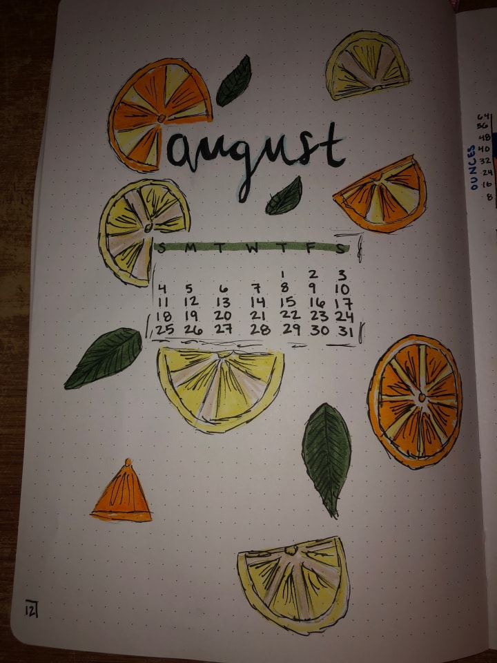 I choose a theme for each month with two or three colors to accompany the theme. For August of 2019, I choose a citrus theme! I always like to have the monthly calendar on the cover page as well so I can get an overview of the month. The colors I chose to carry out through my August spreads were the orange and yellow colors.