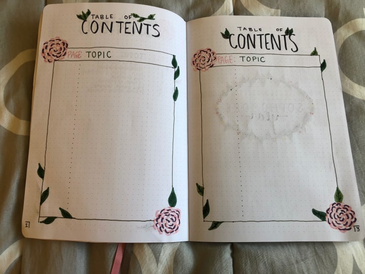 The biggest tip I have is to start your first couple pages with a table of contents and to number ALL of your pages. I would suggest at least 2 front and back pages of the table of contents. Personally, I would rather have more space for the table of contents than not enough. This is overlooked a lot and can really help you organize your journal. From there, everything is 100% up to you and what you think you need to help keep organized :) All of the different types of spreads I talk about will be in the photo gallery at the end of this section.
