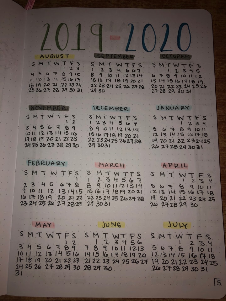 Calendars help to give a great overview of your journal! I organize my journals based off of my school year, so mine starts in August and ends in July. Since that's so abnormal, putting a big calendar in the front of the journal helps me to see what I'm working with right off the bat.