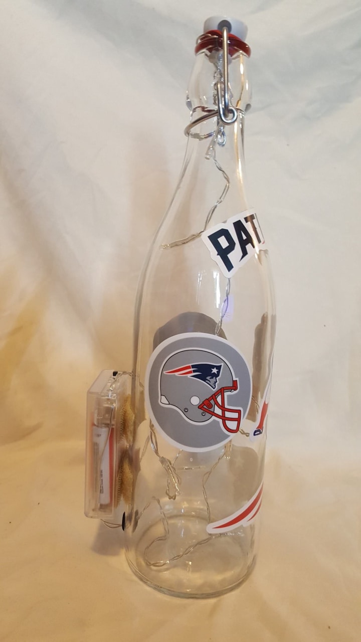 Then, one day a friend of mine reached out to me and asked if I could make a New England Patriots bottle lamp. She wanted to give it to her husband for his birthday. I told her I would try. I really wasn't sure how I could make that bottle lamp for her until one day, while at the local Goodwill I found a clear flip top glass bottle. As soon as I saw that bottle, I thought, "I could find some Patriots stickers and adhere them to this bottle." I decided to go look for some stickers at the local Dollar Tree first (so as to keep my overhead low). I didn't find any Patriots stickers there but I did find some battery powered mini-lights for only $1 and thought, "These will be perfect for some bottle lamps!" But then a thought occurred to me: "How will I attach the mini-lights to the bottle?" Glue wouldn't work, because it would make changing the batteries difficult. Tape wouldn't work because it wouldn't be sturdy enough to last. Then, I remembered I had seen adhesive velcro strips at this Dollar Tree when I bought the decorative pebbles for the Crown Royal lamp! I bought the mini-lights, velcro strips and found Patriot stickers at a sports collectible store and made a Patriots bottle lamp for my friend's husband.