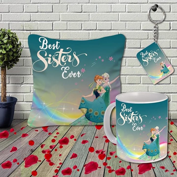 2. AWANI TRENDS Gift Combo for Sister: Coffee Mug, Cushion Cover, and Keychain