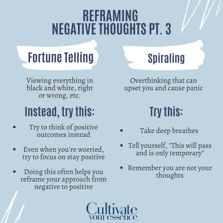 Reframing negative thoughts means taking a negative thought and turning it into a positive or more neutral thought. Here are some examples of how to reframe negative thoughts: