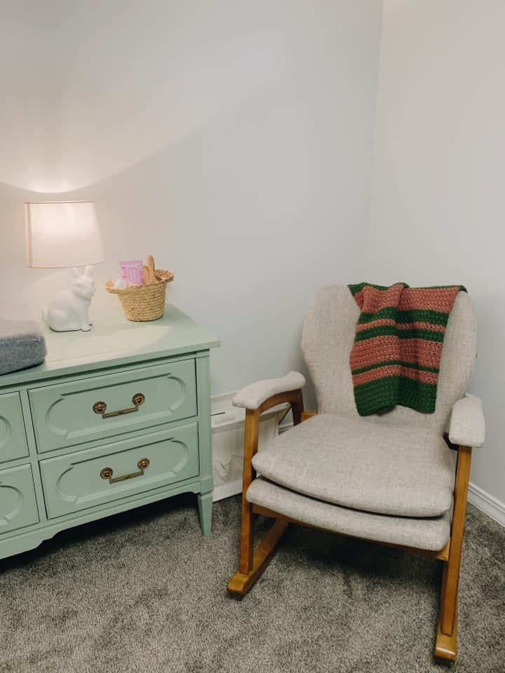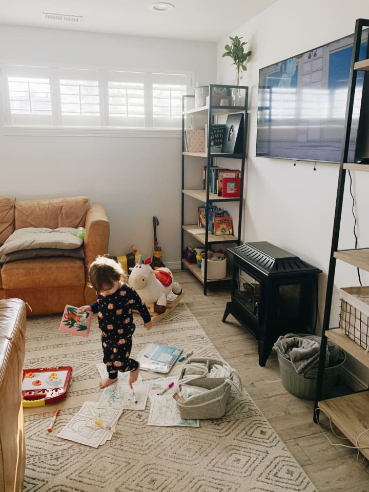 In this area, I have a basket where I keep books for myself and books to read to my daughter. I try not to bring my phone with me when I come to this space. It encourages me to be more present with my daughter and to pick up a book instead of my phone.