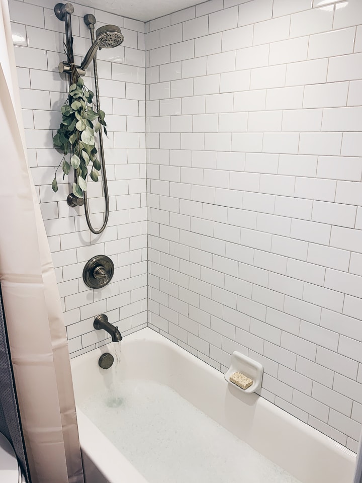 I recently hung this $2.99 eucalyptus from Trader Joe’s on the shower heads of our baths/showers. It doesn’t have the same effect as dropping a drop of Eucalyptus essential oil on the shower floor, but it looks really nice anyway and brings me joy!