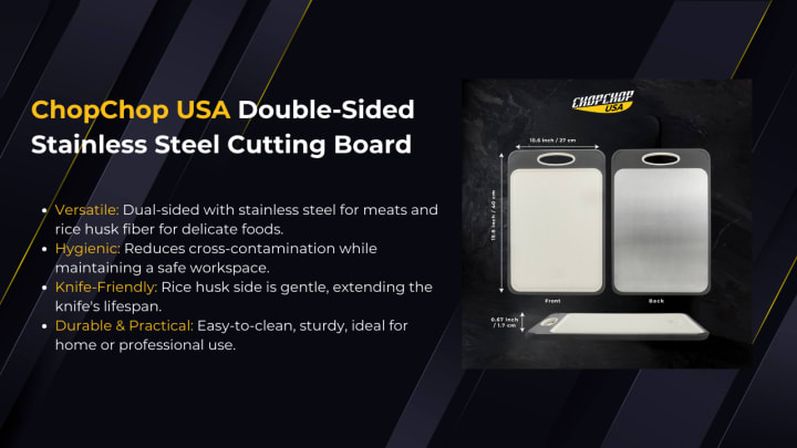 The ChopChop USA Titanium Cutting Board delivers unmatched durability, hygiene, and safety. Non-porous titanium resists bacteria, is dishwasher safe, and preserves knife edges.