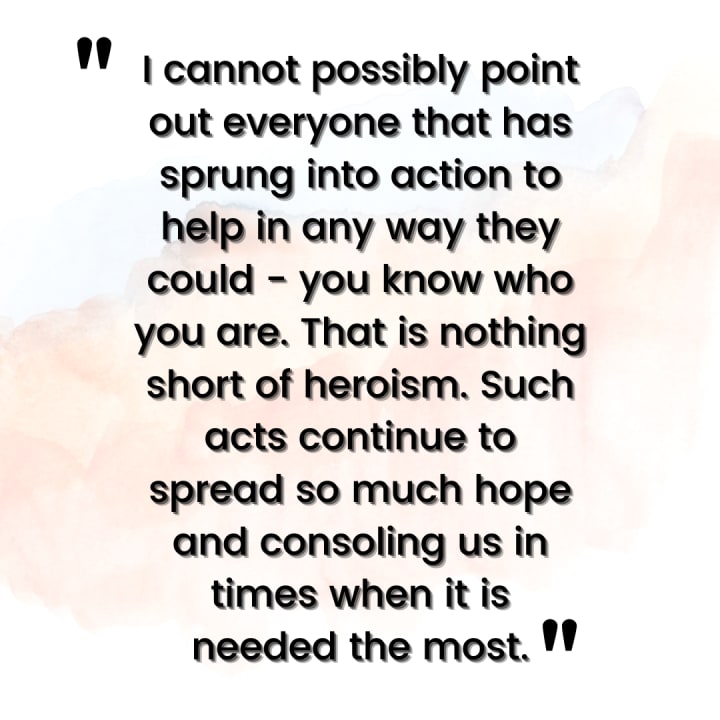 Also, the countless people that sprung into selfless action taking care of those that were in need: the doctors, the government departments, news outlets, media posts, and organizations across the globe all working tirelessly.