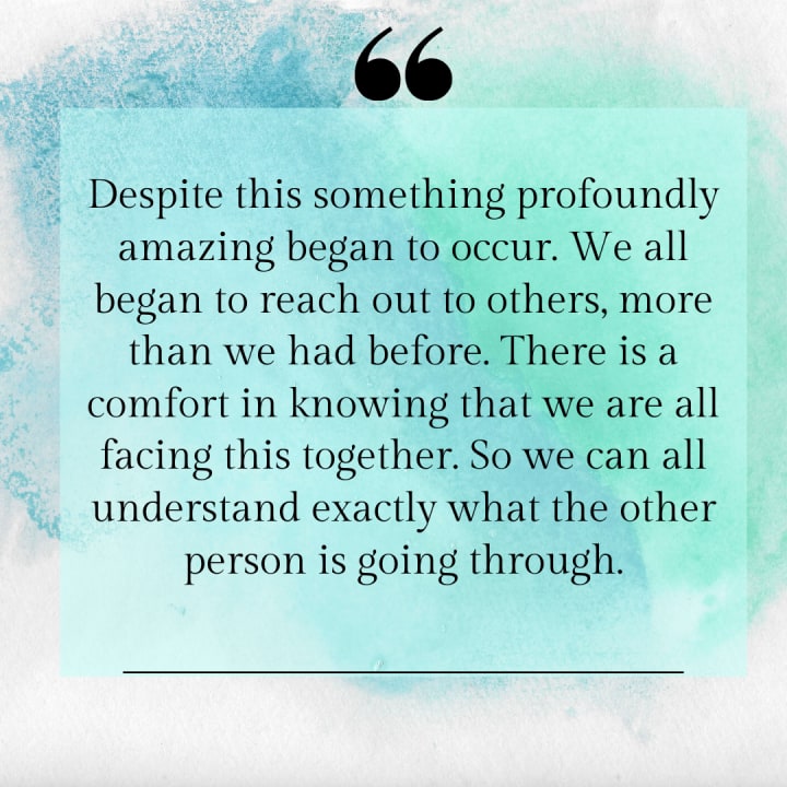 So it's up to us all to strive to be connected, because being alone and living with fear, is not the right way. We have a duty to help others in this, with a more humanitarian view being adapted, we can console and help others cope. Namely, by reaching out and supporting others. It is needed now more than ever, and we can do this collectively.
