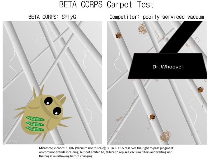 Look at how dirty your carpet is after vacuuming! SPlyG won’t rest until it's satiated. The satiation gene has been removed by our laboratories to guarantee SPlyG never stops.