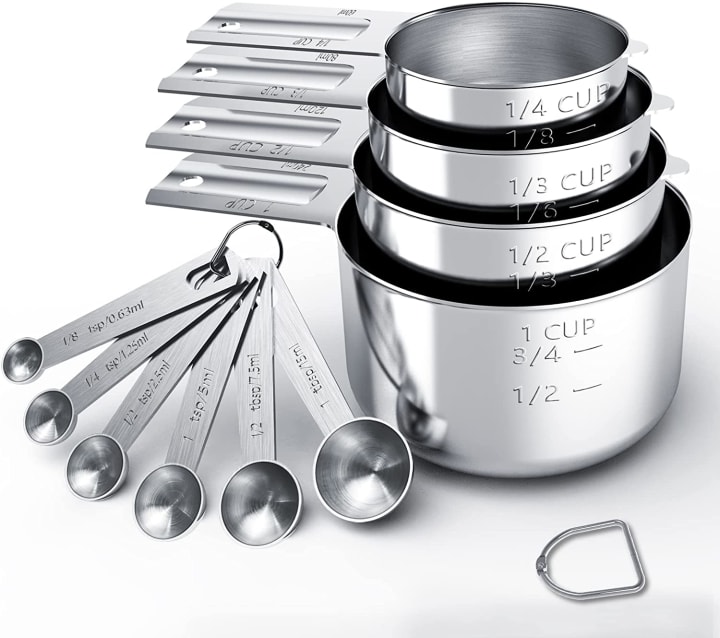 Stainless steel measuring cups are an indispensable accessory for any home cook or baker. This set includes four measuring cups and six measuring spoons, making it versatile enough to meet all your needs when cooking and baking. The measuring cups come in various sizes, including 1/4, 1/3, 1/2, and 1 cup, while the measuring spoons come in sizes ranging from 1/8 tsp to 1 tbsp. One of the most significant advantages of this set is its premium material. Made from food-grade 18/8 stainless steel, it is 100% rust-resistant and contains no toxic elements. This means that it is safe to use for both dry and wet ingredients, and you don’t have to worry about any harmful chemicals leaching into your food. Cleaning this set is also effortless. The stackable design of these professional metal measuring spoons and cups makes them easy to store and keeps them neat and tidy in your kitchen drawers. And when it comes to cleaning, they are dishwasher safe, making it a perfect solution to cheap plastic measuring sets. One of the most significant advantages of this set is how easy it is to use. Each measuring cup and spoon has clearly engraved size marks, which ensures that you can measure ingredients accurately without guessing or making mistakes. Finally, the manufacturer offers a 100% satisfaction guarantee to allow you to test the set. If you are not satisfied with the product, the manufacturer is available to provide assistance and solutions to ensure that you are happy with your purchase. Overall, the stainless steel measuring cups set is an excellent investment for anyone who loves to cook or bake.