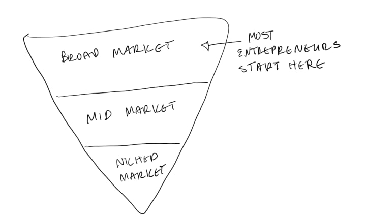 Most people want to start from the widest part of the triangle because they see a wide audience of potential buyers; but because they haven't taken the proper time to establish themself within a marketplace, they are only but a fish in the water in an ocean of competitors.