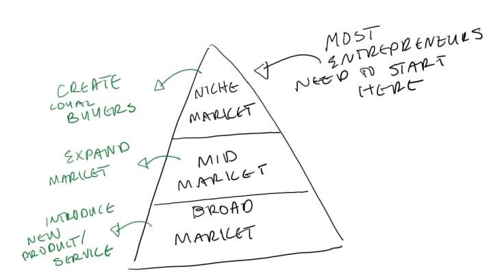 Here's why, when you master a very small niched part of the market, you create an opportunity to have a very loyal set of buyers that will follow you as you expand into a larger part of the market. Once you've mastered the tippy top and max out all the potential buyers in one segment of the market, THEN you're able to move on to a larger part.