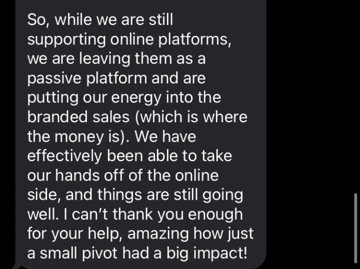Also, it's important that you follow the money. Stop wasting time, energy, and efforts into something that isn't yielding the highest return on your time. Pick one revenue stream that's provided the bulk of your revenue and do more of that. Only once have you mastered that revenue stream can you decide to move onto something else.