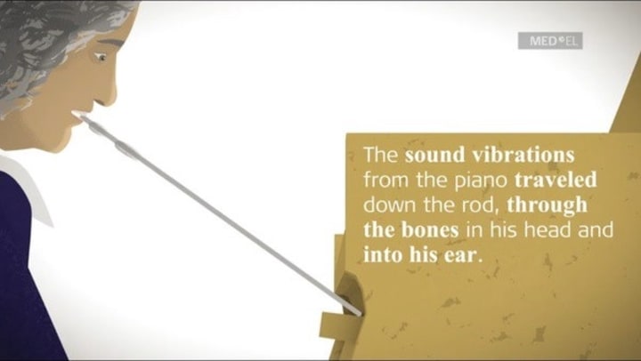 In Beethoven's case, the vibrations caused by the piano as a source of sound are transmitted through the baton to the jawbone on the side of the mouth, and then from the frontal bone to the inner ear, which eventually formed hearing.