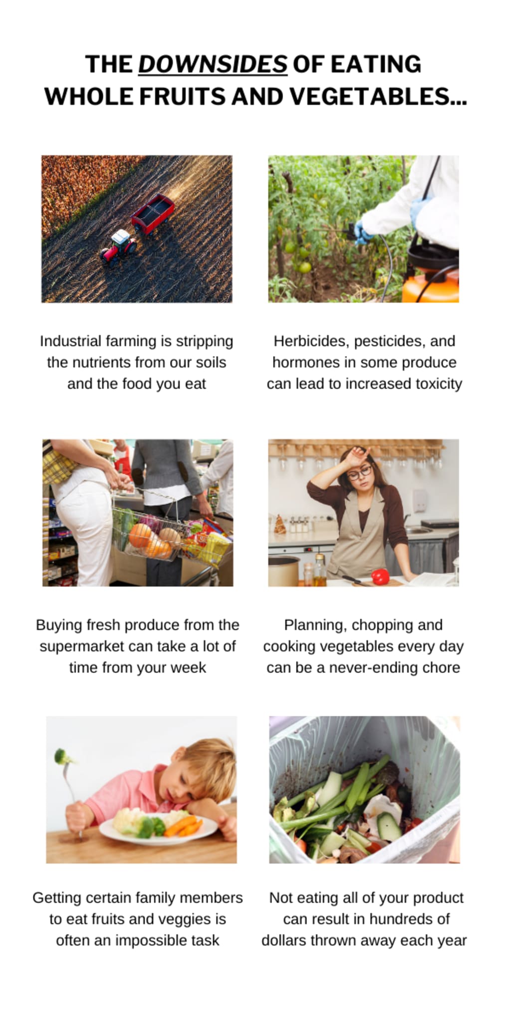 You see, while eating whole fruits and vegetables may provide your body with essential nutrients, they do so at a cost: