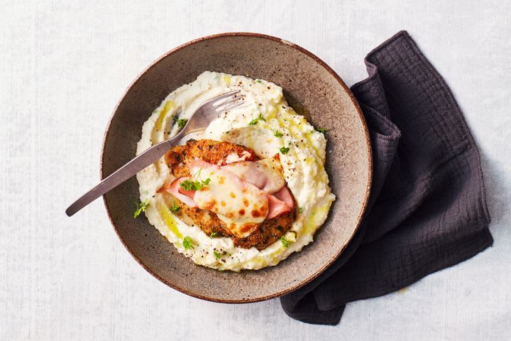 The keto version of cheesy chicken parmigiana is now available! It's the ultimate low-carb dinner, coated with almond meal and served with cauliflower mash.
